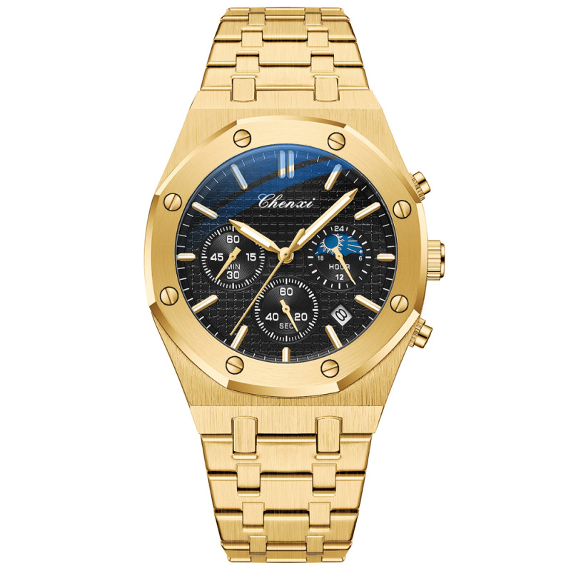 - Feature: STOP WATCH,Shock Resistant,Auto Date,Chronograph,Complete Calendar,Water Resistant,Week Display,luminous hands