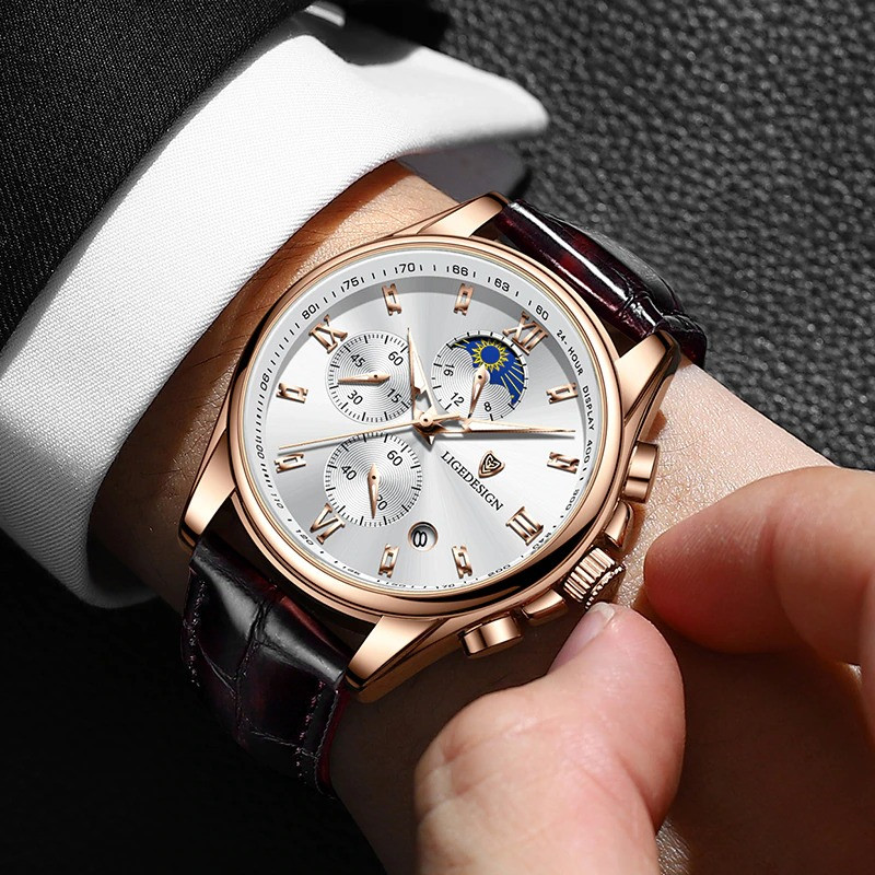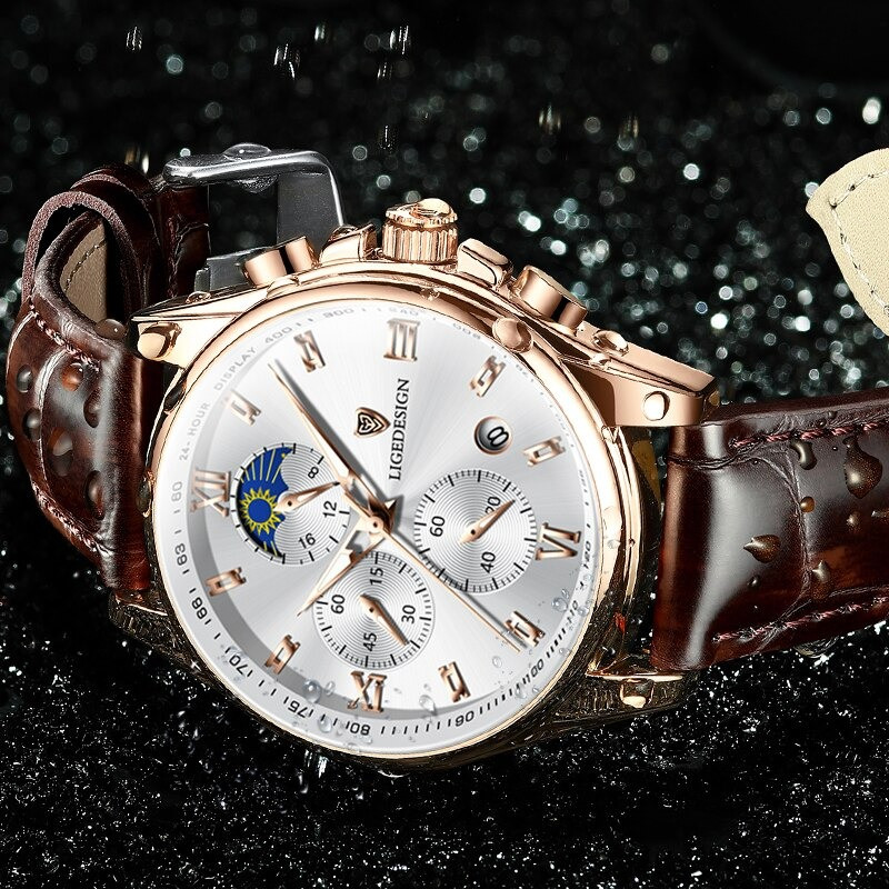 LIGE 8951 Top Brand Leather Chronograph Waterproof watch
