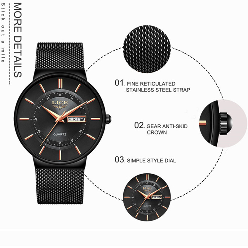 LIGE Top Brand Luxury Waterproof Ultra Thin Date Clock Male Steel Strap Casual Quartz Watch Men Sports Wrist Watch