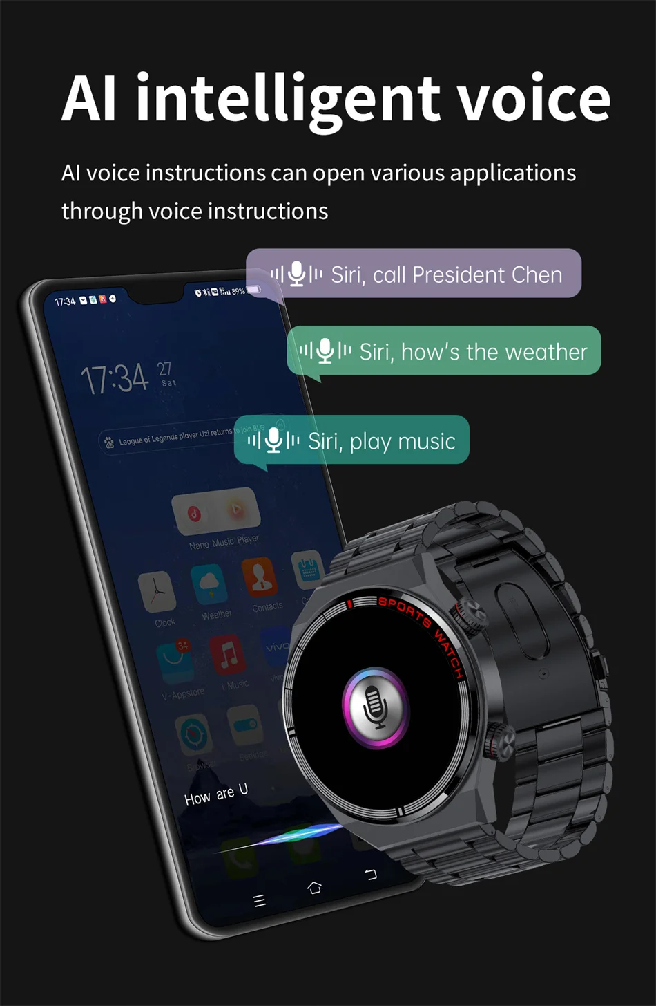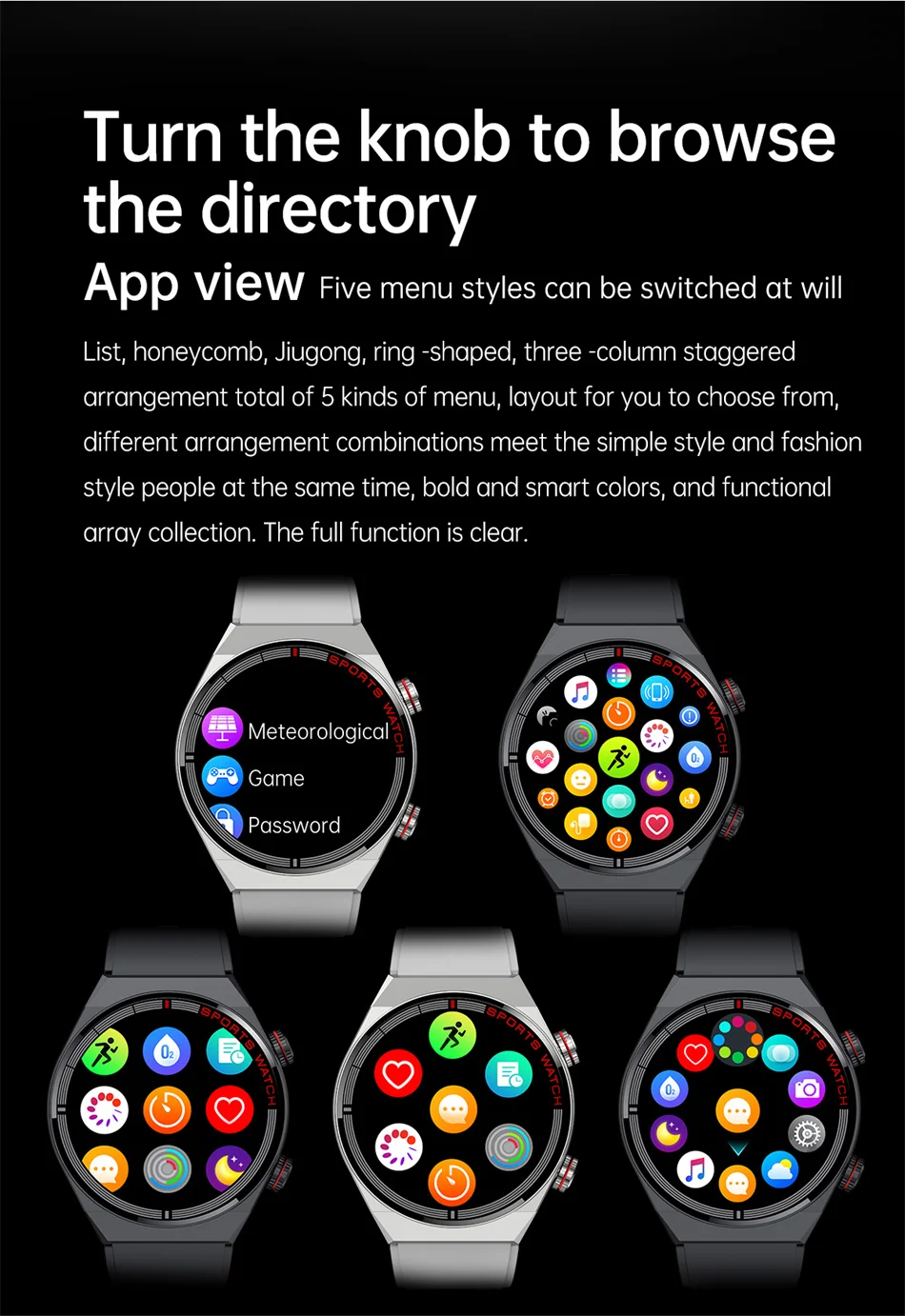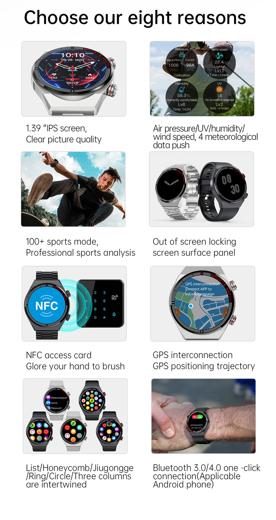 Features: 1. Weather data (4 functions of barometric pressure/UV/ humidity/wind speed) 2. 100+ sports modes 3. Screen off lock, screen off dial 4. Alipay payment, WeChat cash code, Alipay cash code, WeChat QR code 5. GPS interconnection 6. 5 UI styles (list/honeycomb/nine grid/ring/three interlaced columns) 7. Bluetooth 3.0/4.0 one key connection (for Android) (for Android phones) 8. Bluetooth calling, voice assistant, Bluetooth music 9.game