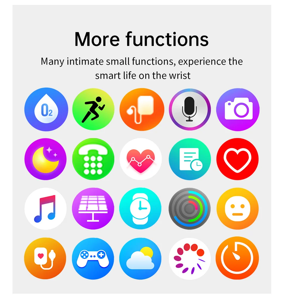 Basic functions: date/day of the week display, weather push, physiological cycle (APP-gender setting is female only), countdown timer, card management, remote photo taking, sedentary reminder, pedometer, distance, calories, heart rate/blood pressure/blood oxygen/stress/cardiac/body temperature/sleep monitoring, Bluetooth music control, incoming call reminder, SMS reminder, social app message reminder, alarm reminder, exercise mode, exercise mode, exercise mode. Raise hand to light up screen, find phone, stopwatch, reject call, do not disturb mode, multi-dial switch, custom dial, brightness adjustment, firmware upgrade, etc.