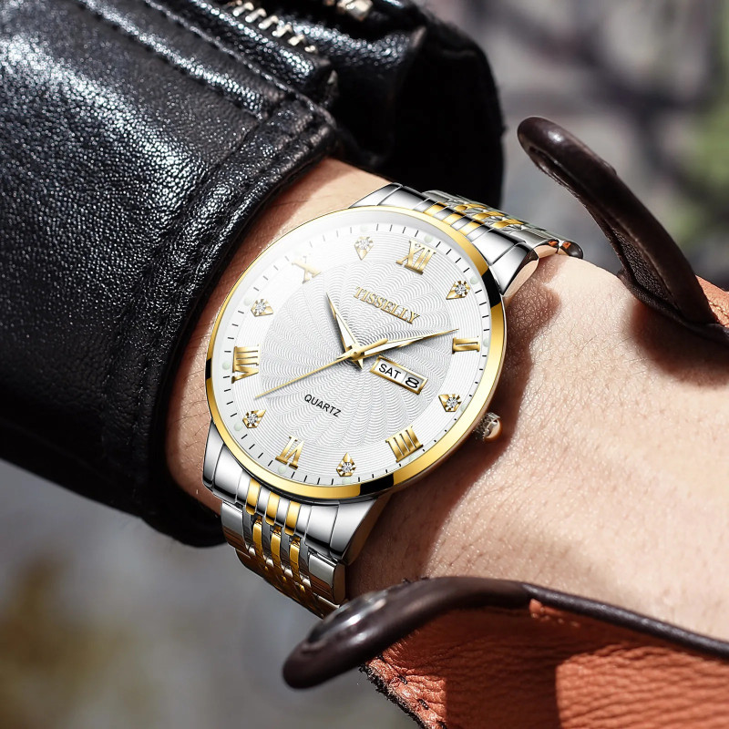 Stainless Steel Band Classic Mens Gold Watch Diamond Quartz